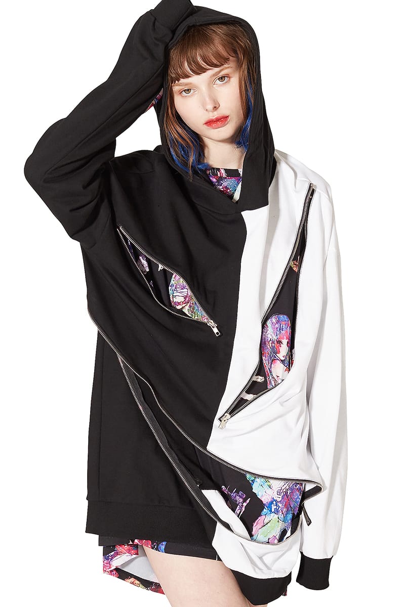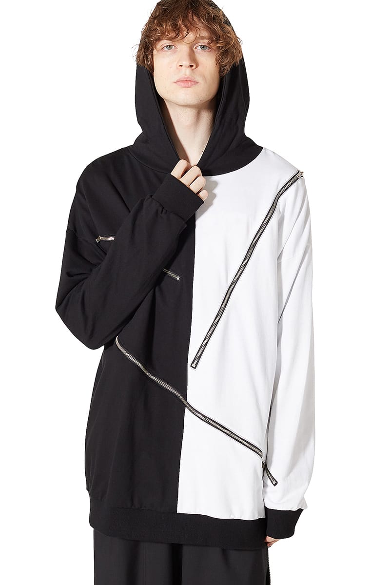ダッポリとした極ワイドな身幅、滑らかに肩を落としたドロップショルダーのルーズなフォルムバランス、巨大なフード、超ロング丈で膝丈まで包み込むようなスーパービッグシルエット/オーバーサイズ×アシンメトリーでクレイジーに配置したジップファスナーがマッドポップ。