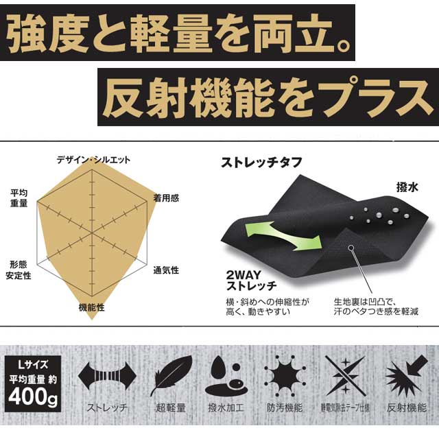 ・カラー :92ブラック×チャコールグレー 95ブラック×ブラック ・素材 :ストレッチタフ ・混率 :ポリエステル100% [特徴]SS・Sサイズはレディースシルエット ストレッチ 超軽量 撥水加工 防汚機能静電気除去テープ仕様反射機能 ※取り寄せ商品、在庫の有無と納期は後日連絡 サイズSS〜4Lはこちらから