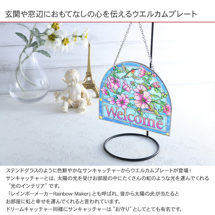 商品説明玄関や窓辺におもてなしの心を伝えるウエルカムプレートステンドグラスのように色鮮やかなサンキャッチャーからウエルカムプレートが登場!サンキャッチャーとは、太陽の光を受けお部屋の中にたくさんの虹のような光を運んでくれる“光のインテリア”です。